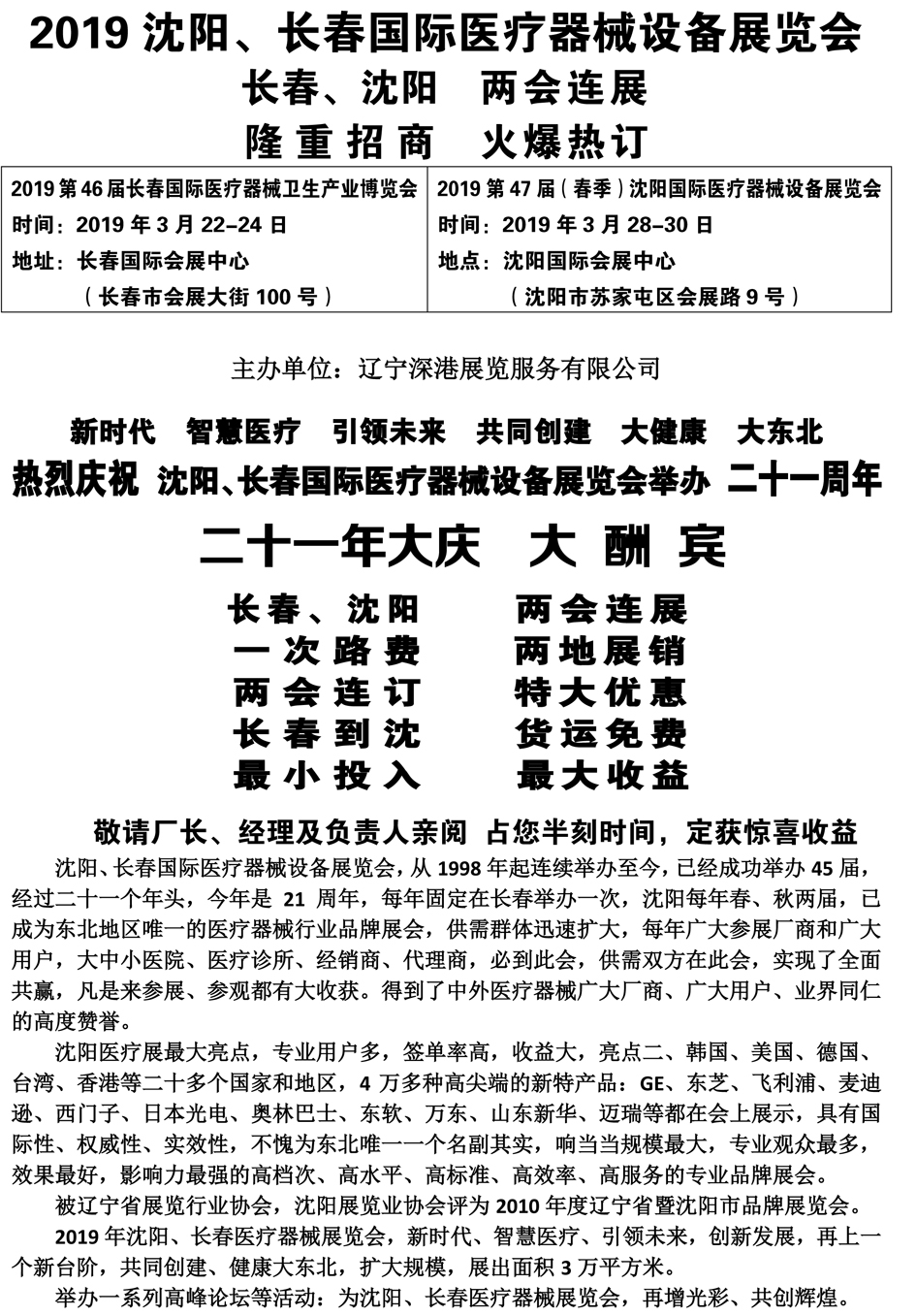 2019沈陽、長(zhǎng)春醫(yī)療器械設(shè)備展覽會(huì) 兩會(huì)連展 特大優(yōu)惠!