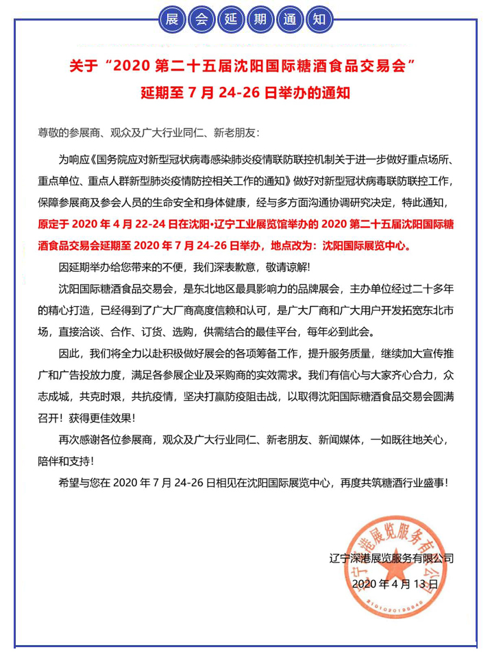 【重要通知】關(guān)于“2020第二十五屆沈陽國際糖酒食品交易會”延期至7月24-26日舉辦的通知