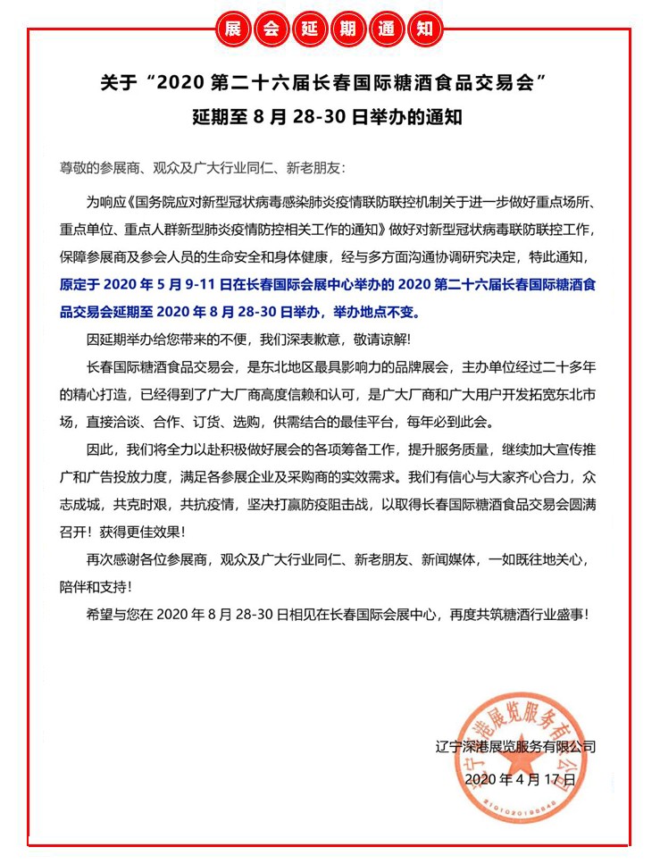 【重要通知】關(guān)于“2020第二十六屆長春國際糖酒食品交易會”延期至8月28-30日舉辦的通知