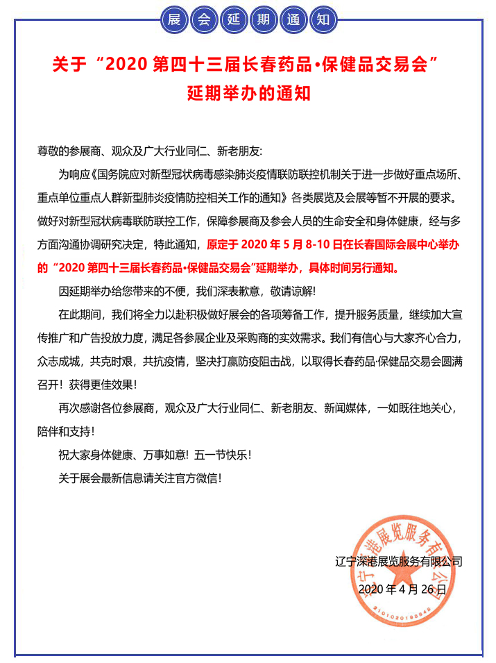 | 【重要通知】關(guān)于“2020第四十三屆長春藥品·保健品交易會”延期舉辦的通知 | |