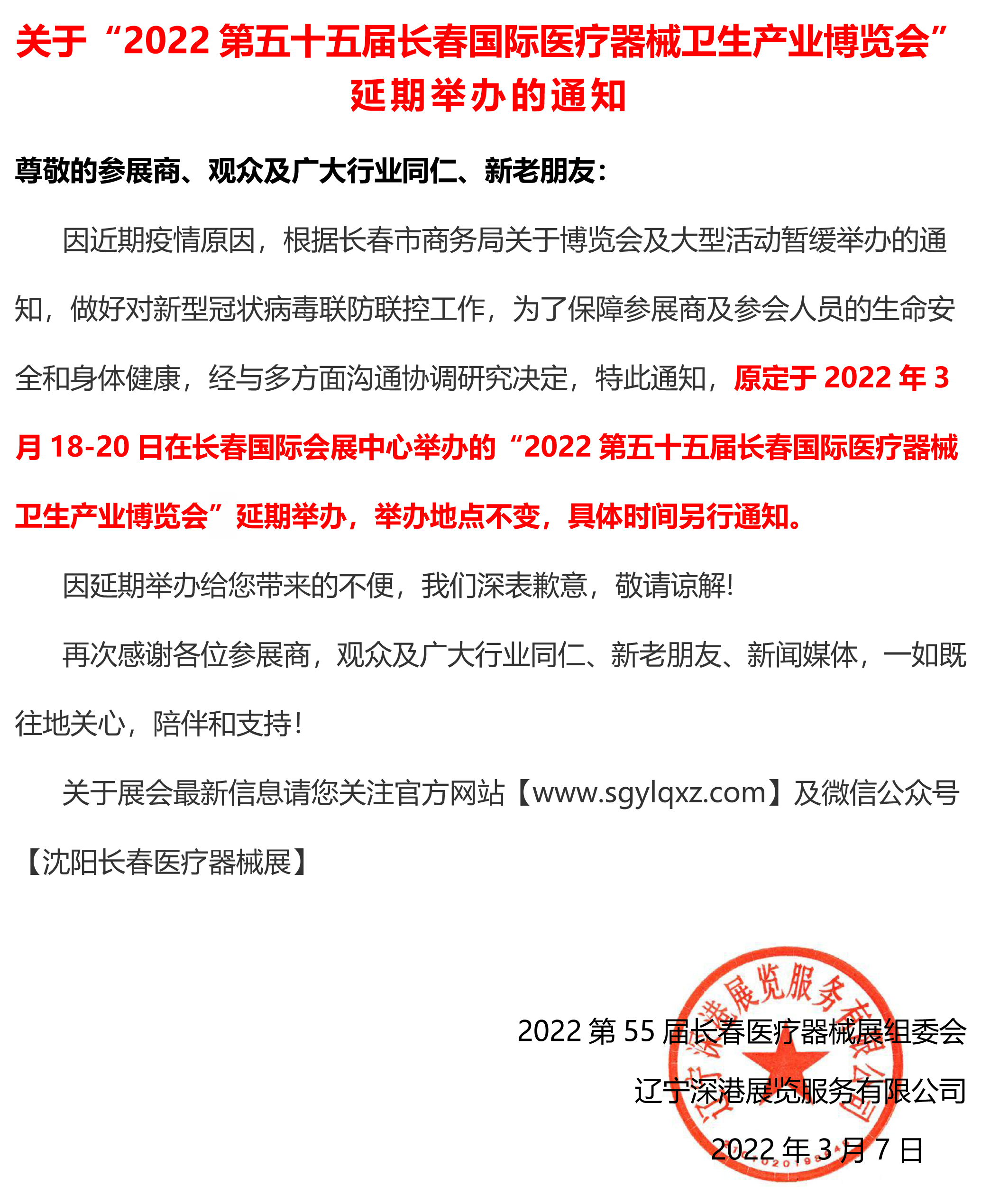 延期通知|2022第五十五屆長春國際醫(yī)療器械衛(wèi)生產(chǎn)業(yè)博覽會