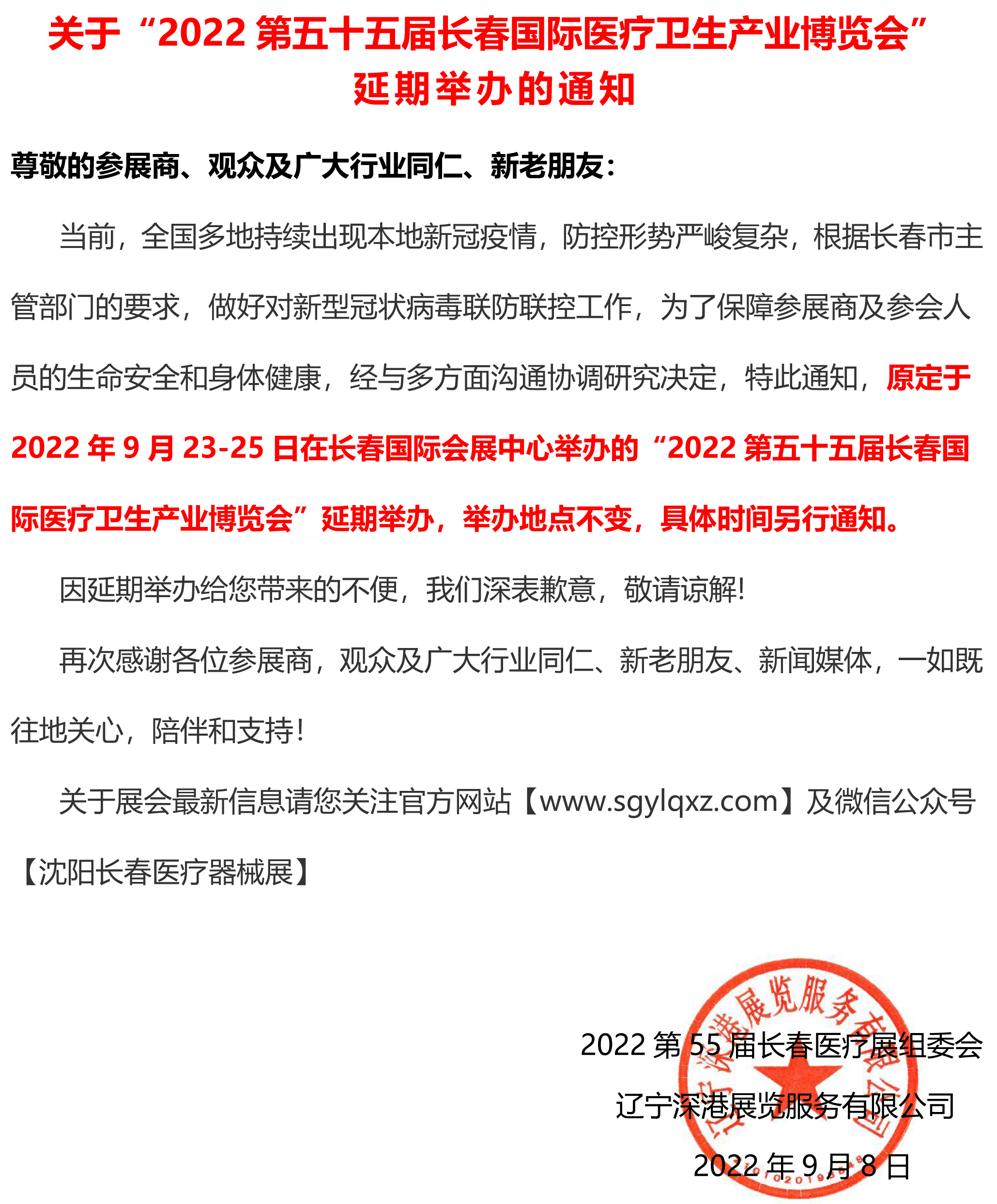 關(guān)于“2022第五十五屆長春國際醫(yī)療衛(wèi)生產(chǎn)業(yè)博覽會(huì)”延期舉辦的通知