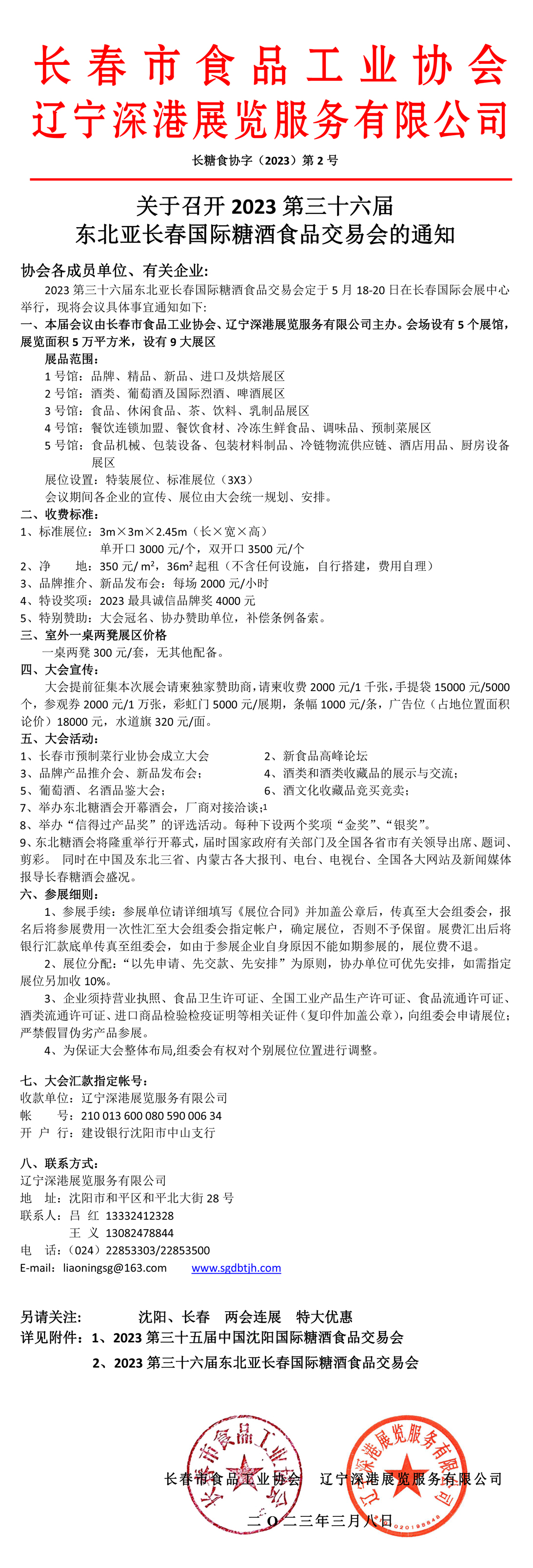 協(xié)會各成員單位、有關(guān)企業(yè): 2023第三十六屆東北亞長春國際糖酒食品交易會定于5月18-20日在長春國際會展中心舉行,現(xiàn)將會議具體事宜通知如下: 一、本屆會議由長春市食品工業(yè)協(xié)會、遼寧深港展覽服務(wù)有限公司主辦。會場設(shè)有5個展館,展覽面積5萬平方米,設(shè)有9大展區(qū) 展品范圍: 1號館:品牌、精品、新品、進口及烘焙展區(qū) 2號館:酒類、葡萄酒及國際烈酒、啤酒展區(qū) 3號館:食品、休閑食品、茶、飲料、乳制品展區(qū) 4號館:餐飲連鎖加盟、餐飲食材、冷凍生鮮食品、調(diào)味品、預制菜展區(qū) 5號館:食品機械、包裝設(shè)備、包裝材料制品、冷鏈物流供應(yīng)鏈、酒店用品、廚房設(shè)備展區(qū) 展位設(shè)置:特裝展位、標準展位(3X3) 會議期間各企業(yè)的宣傳、展位由大會統(tǒng)一規(guī)劃、安排。 二、收費標準: 1、標準展位:3m×3m×2.45m(長×寬×高) 單開口3000元/個,雙開口3500元/個 2、凈 地:350元/ m2,36m2起租(不含任何設(shè)施,自行搭建,費用自理) 3、品牌推介、新品發(fā)布會:每場2000元/小時 4、特設(shè)獎項:2023最具誠信品牌獎4000元 5、特別贊助:大會冠名、協(xié)辦贊助單位,補償條例備索。 三、室外一桌兩凳展區(qū)價格 一桌兩凳300元/套,無其他配備。 四、大會宣傳: 大會提前征集本次展會請柬獨家贊助商,請柬收費2000元/1千張,手提袋15000元/5000個,參觀券2000元/1萬張,彩虹門5000元/展期,條幅1000元/條,廣告位(占地位置面積論價)18000元,水道旗320元/面。 五、大會活動: 1、長春市預制菜行業(yè)協(xié)會成立大會 2、新食品高峰論壇 3、品牌產(chǎn)品推介會、新品發(fā)布會; 4、酒類和酒類收藏品的展示與交流; 5、葡萄酒、名酒品鑒大會; 6、酒文化收藏品競買競賣; 7、舉辦東北糖酒會開幕酒會,廠商對接洽談; 8、舉辦“信得過產(chǎn)品獎”的評選活動。每種下設(shè)兩個獎項“金獎”、“銀獎”。 9、東北糖酒會將隆重舉行開幕式,屆時國家政府有關(guān)部門及全國各省市有關(guān)領(lǐng)導出席、題詞、剪彩。 同時在中國及東北三省、內(nèi)蒙古各大報刊、電臺、電視臺、全國各大網(wǎng)站及新聞媒體報導長春糖酒會盛況。 六、參展細則: 1、參展手續(xù):參展單位請詳細填寫《展位合同》并加蓋公章后,傳真至大會組委會,報名后將參展費用一次性匯至大會組委會指定帳戶,確定展位,否則不予保留。展費匯出后將銀行匯款底單傳真至組委會,如由于參展企業(yè)自身原因不能如期參展的,展位費不退。 2、展位分配:“以先申請、先交款、先安排”為原則,協(xié)辦單位可優(yōu)先安排,如需指定展位另加收10%。 3、企業(yè)須持營業(yè)執(zhí)照、食品衛(wèi)生許可證、全國工業(yè)產(chǎn)品生產(chǎn)許可證、食品流通許可證、酒類流通許可證、進口商品檢驗檢疫證明等相關(guān)證件(復印件加蓋公章),向組委會申請展位;嚴禁假冒偽劣產(chǎn)品參展。 4、為保證大會整體布局,組委會有權(quán)對個別展位位置進行調(diào)整。